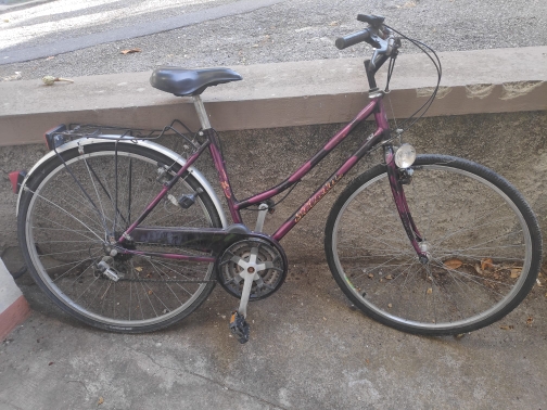 - – una bici da donna tipo city-bike marca Atala a 6 velocità (6 pignoni posteriori) di colore nero e viola.