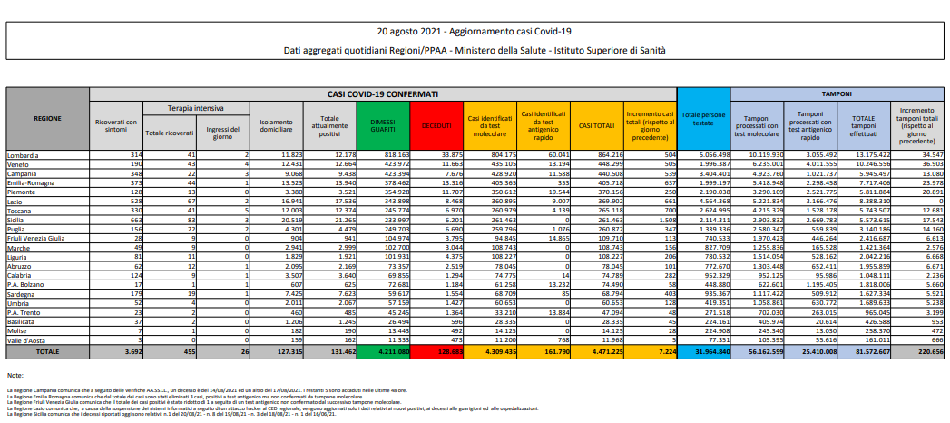 Covid, Italia: il bollettino di venerdì 20 agosto