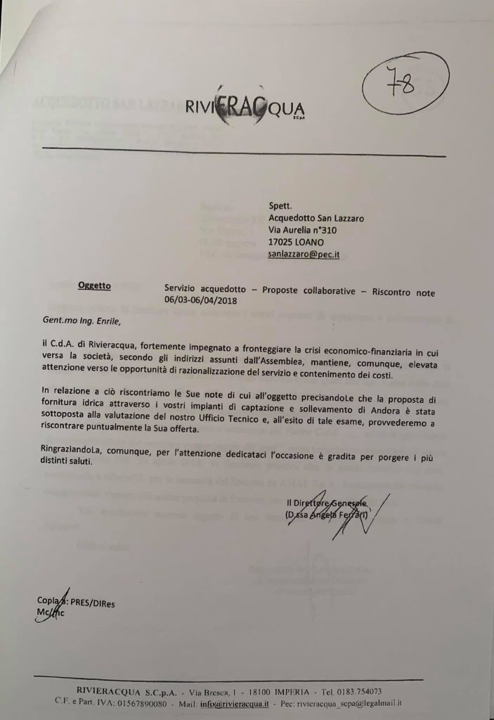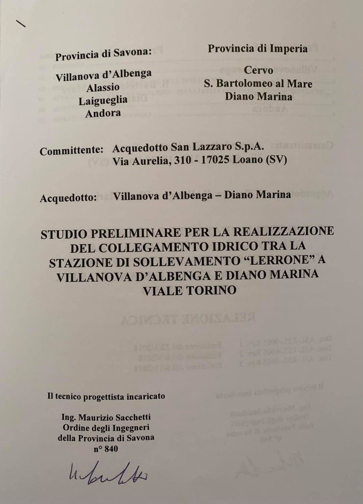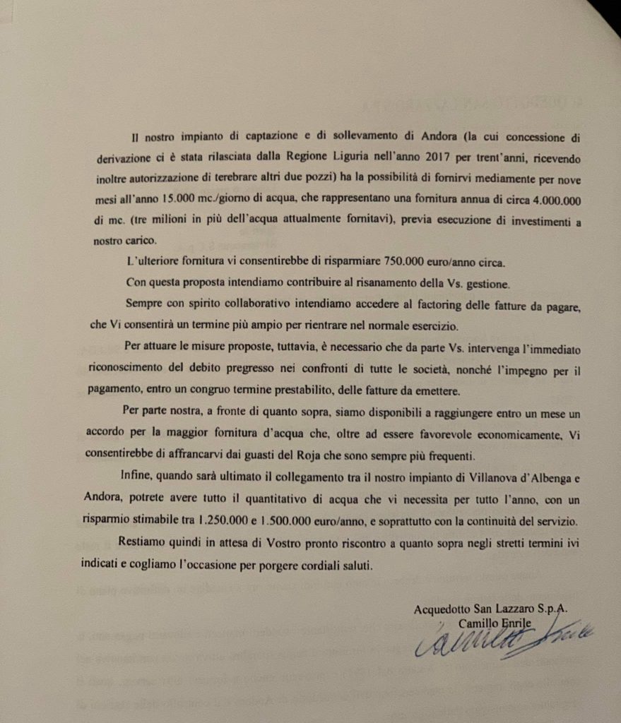 Spiega l’amministratore delegato di Acquedotto San Lazzaro Spa, Camillo Errile: “Nel marzo 2018 avevamo presentato a Rivieracqua una proposta che prevedeva un rifornimento idrico dalle falde dell’Arroscia, nel comune di Villanova d’Albenga. Lo sapevano anche i sindaci del Dianese e quelli di Alassio e Laigueglia, la Provincia di Imperia, che sapevano anche che il progetto avrebbe comportato un costo di fornitura di 41 centesimi a metro cubo, contro i 55 centesimi a metro cubo pagati ad Amat e contestati perfino dal Tribunale nel recente Decreto”.