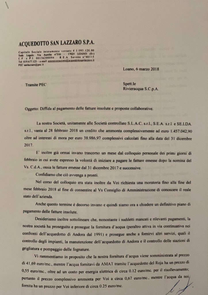 Considerato che il ricorso di Rivieracqua al Tribunale di Imperia per ottenere l’ammissione al concordato preventivo era stato depositato il 5 luglio del 2018, viene spontaneo domandarsi come mai questa proposta non abbia avuto alcun seguito, per lo meno per quanto è dato sapere, soprattutto visto che, poco dopo la richiesta di concordato, arrivò anche l’istanza di fallimento di Amat nei confronti di Rivieracqua, proprio per il mancato pagamento delle fatture per la fornitura idrica al Golfo Dianese.