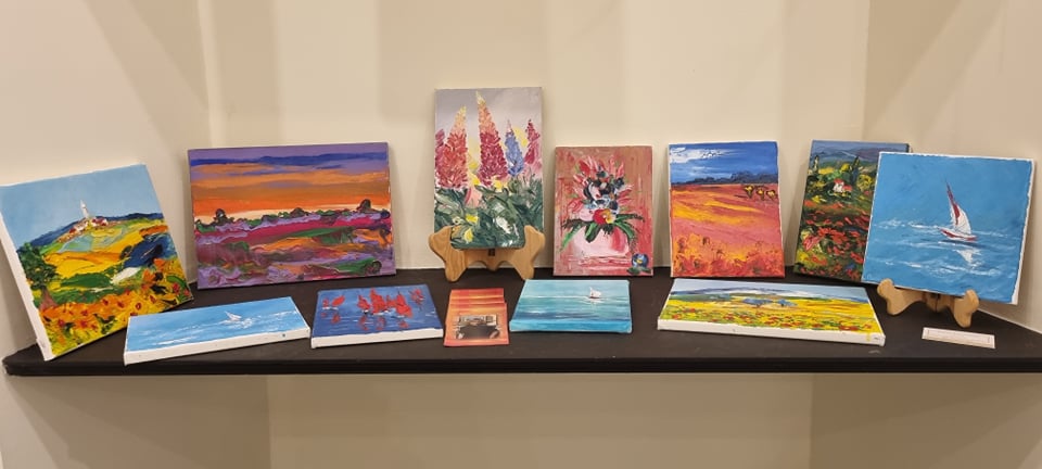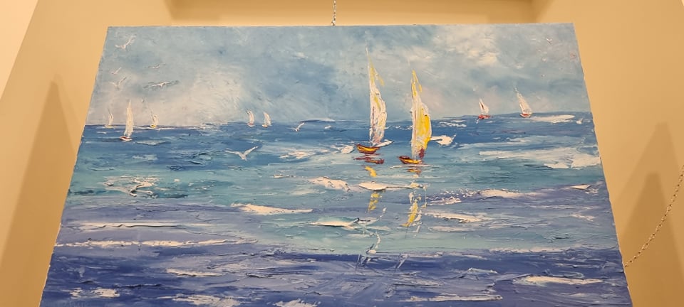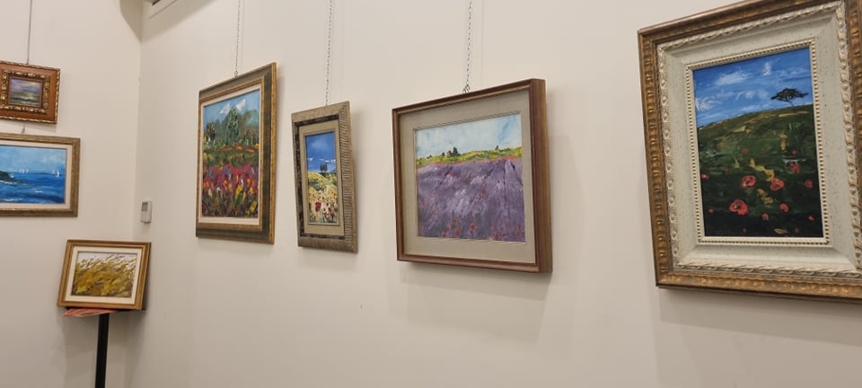 In questa sala ci sono i miei quadri, dipingo paesaggi, marine e fiori, con colori molto vivaci. Lavoro con olio e spatola e butto sulla tela tutte le mie emozioni.