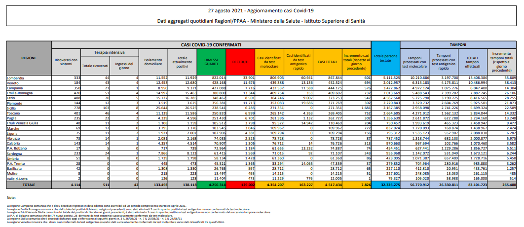 Covid, Italia: il bollettino di venerdì 27 agosto