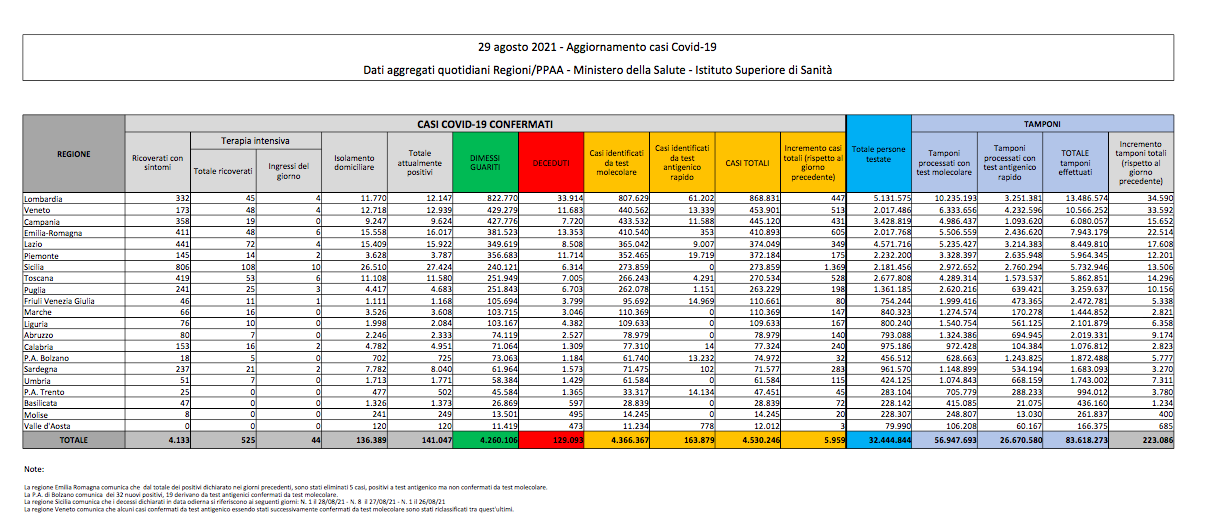 Covid, Italia: il bollettino di domenica 29 agosto