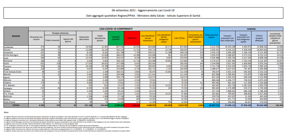 Covid, Italia: il bollettino di lunedì 6 settembre 2021