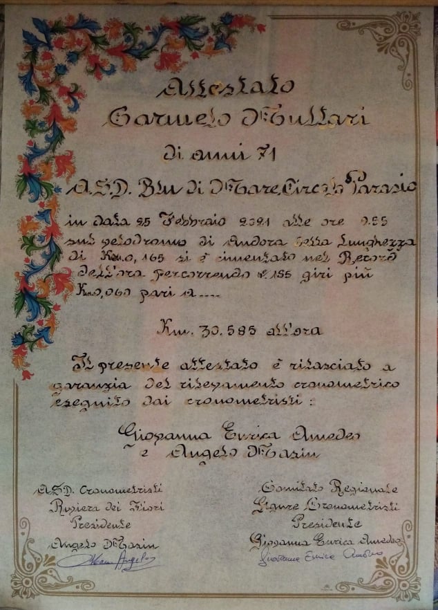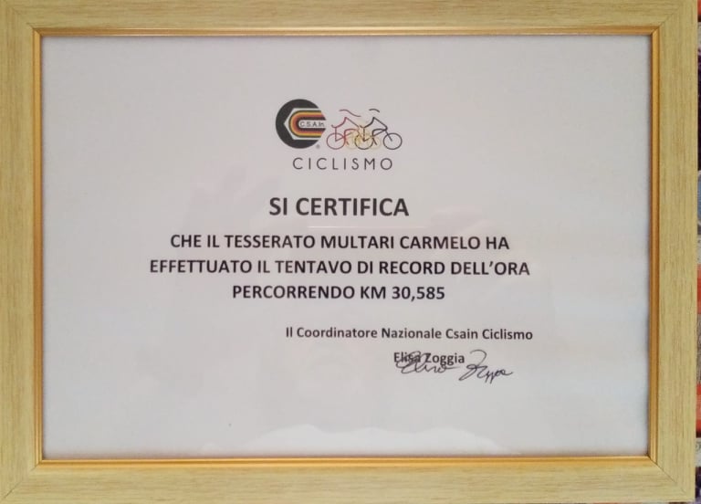 A distanza di alcuni mesi, Multari ha ricevuto i certificati che attestano la sua prova, terminata con 186 giri della pista, per un totale di 30,585 km, compiuti in un’ora.