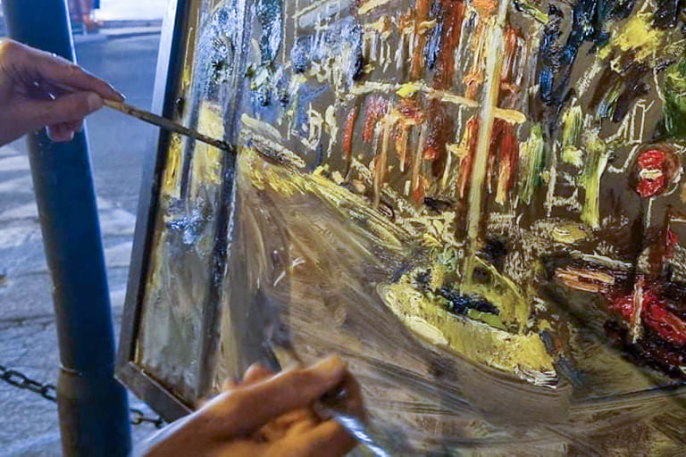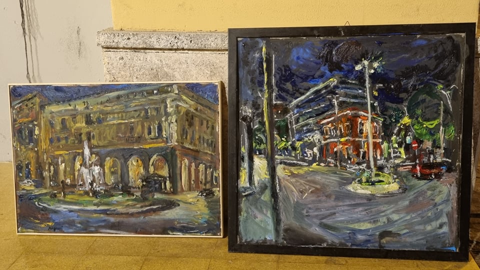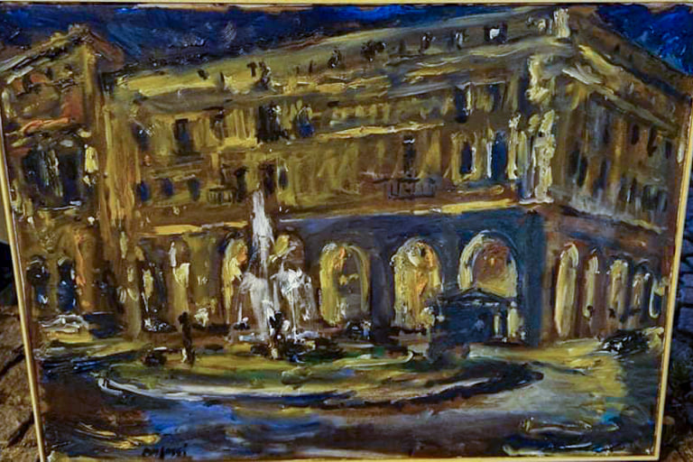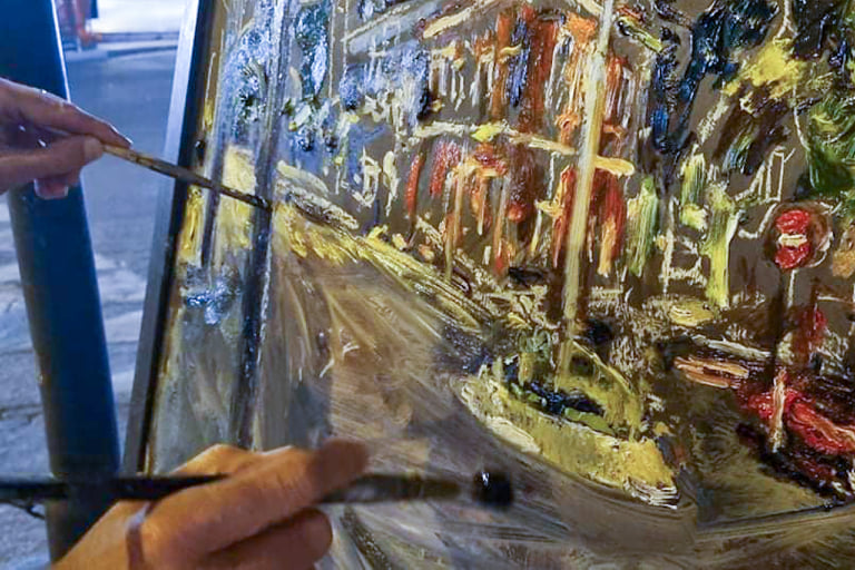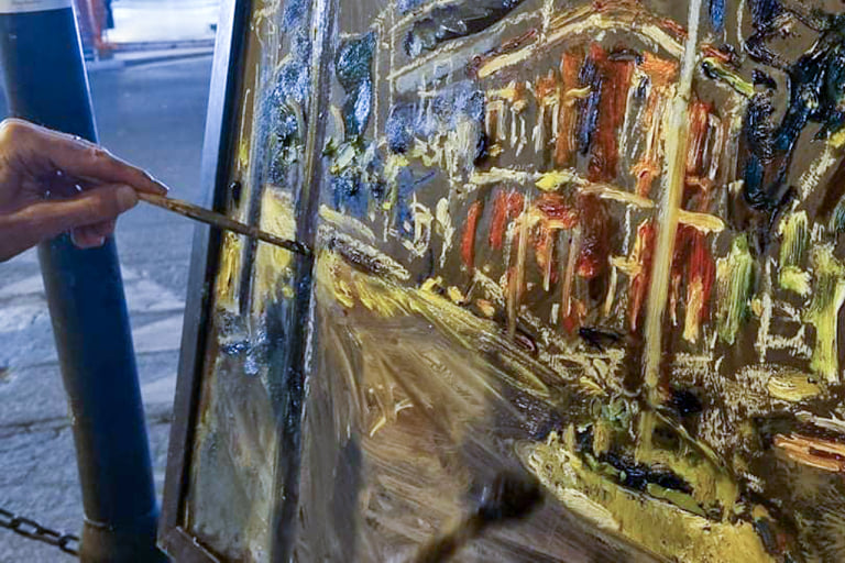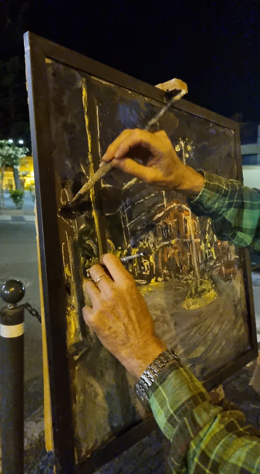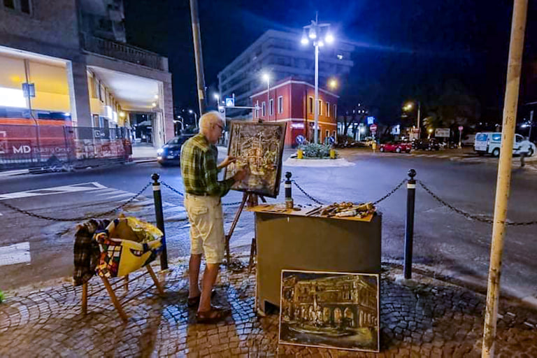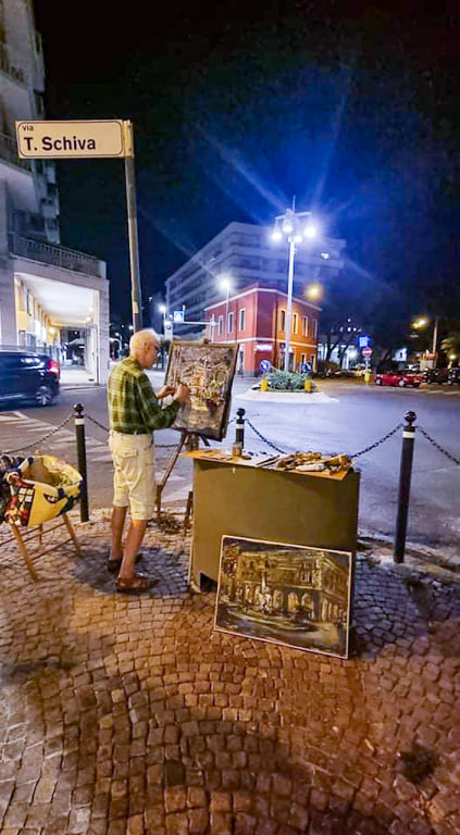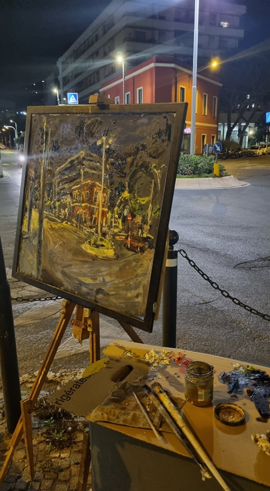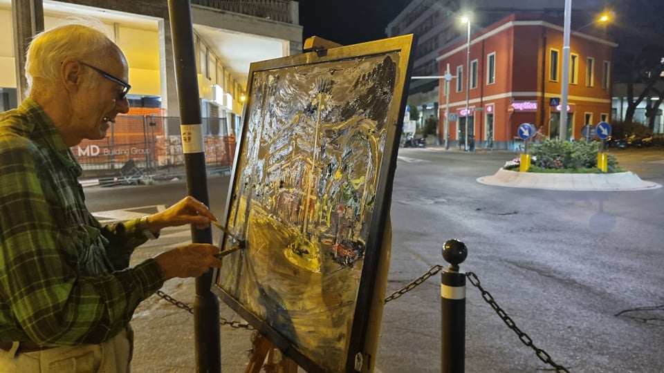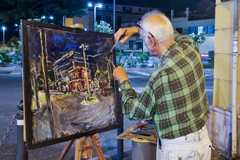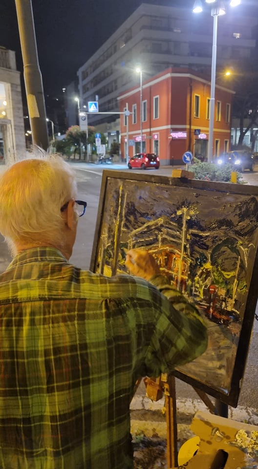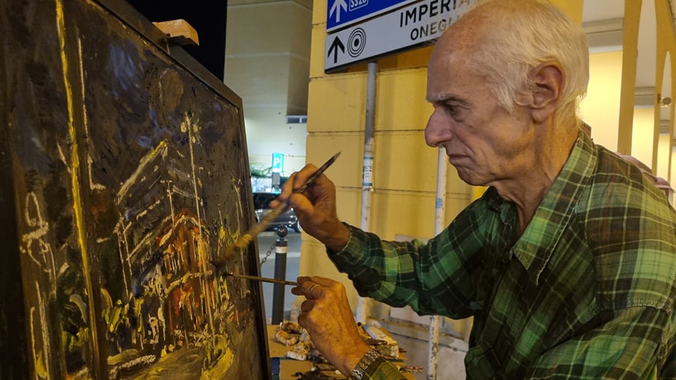 Immaginate di rientrare a casa, in una notte qualunque, attraversando il centro di Oneglia, deserto. Solo alcune auto a rompere il silenzio. Immaginate poi di notare, con la coda dell’occhio, un movimento al lato della strada, quasi una danza, ma silenziosa, e, fermandovi un momento, scoprire che si tratta di un pittore che sta dipingendo un quadro sul marciapiede, con cavalletto, colori, pennelli e tutto il necessario, “en plein air”.