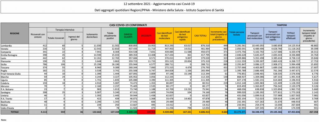 Sono 4.664 i nuovi casi di coronavirus in Italia (ieri sono stati +5.193). I decessi delle ultime 24 ore sono stati 34, (ieri 57), per un totale di 129.919 vittime da febbraio 2020. Le persone guarite o dimesse sono complessivamente 4.349.160. Gli attuali positivi sono in tutto 127.334, (-292 rispetto a ieri, -863 il giorno prima).