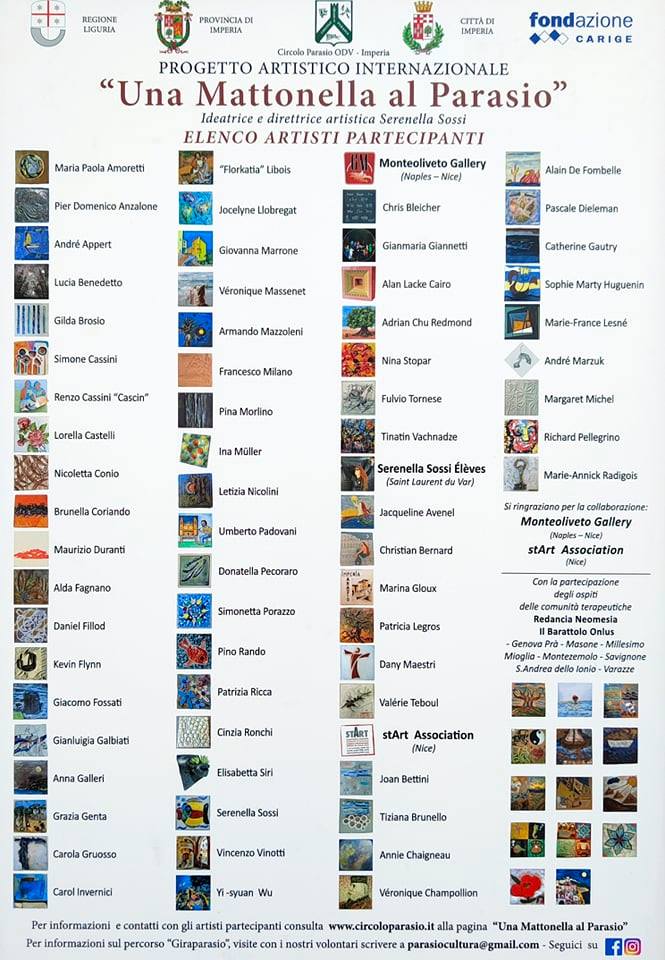 Dice Simona Gazzano, presidente del Circolo Parasio: “Abbiamo inaugurato il balcone degli artisti nell’ambito della rassegna Una mattonella per il Parasio. Ora c’è un punto di interesse in più, che è questa distesa di mattonelle che andremo ad ampliare negli anni. La maggior parte delle mattonelle provengono dall’estero, da artisti di professione, ma una parte è stata realizzata anche da membri delle comunità terapeutiche. Abbiamo creato non solo un momento di aggregazione, ma anche un nuovo punto di interesse. In totale sono 98 le mattonelle esposte in modo permanente”.
