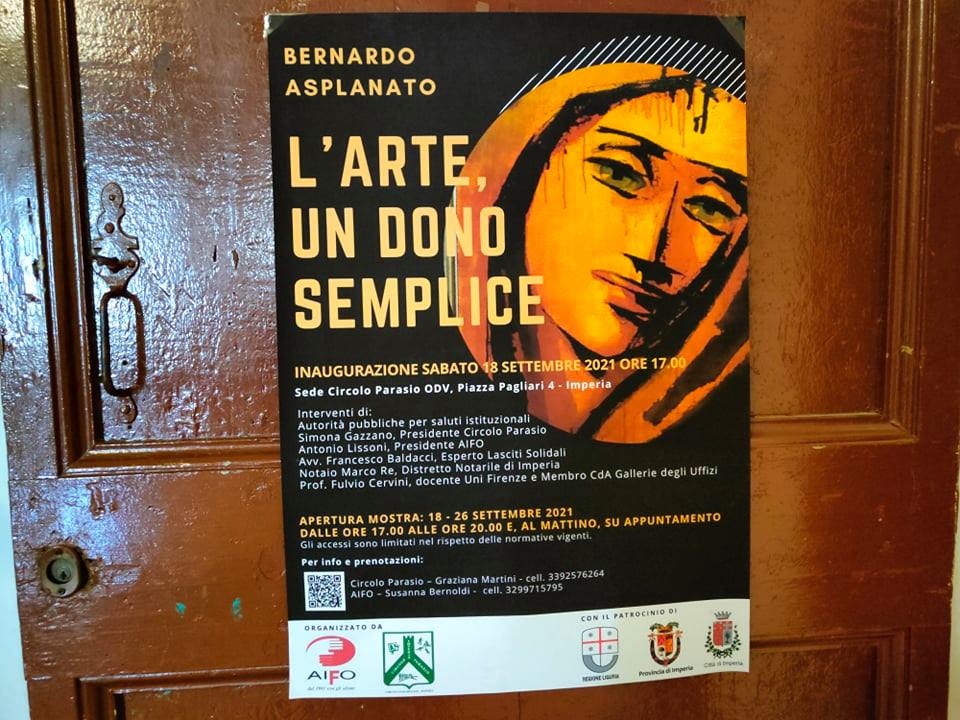 È stata inaugurata ieri, presso il Circolo Paradiso, piazza Pagliari 4, nella città di Imperia, la mostra “L’arte, un dono semplice”, interamente dedicata alle opere di Bernardo Asplanato. L’evento è stato organizzato da Aifo e il Circolo Parasio.