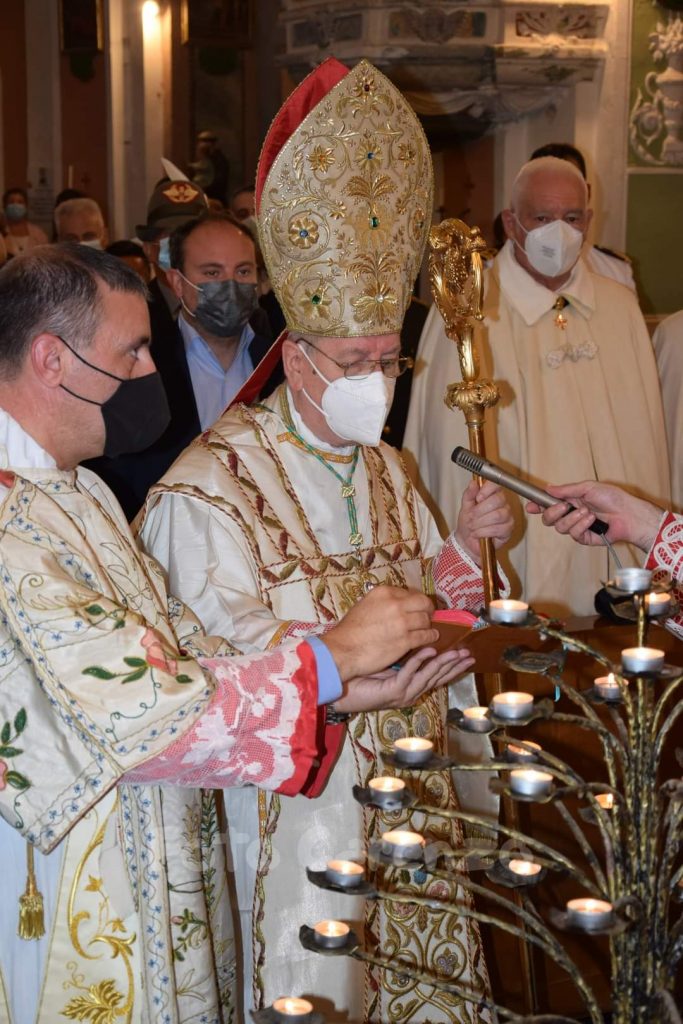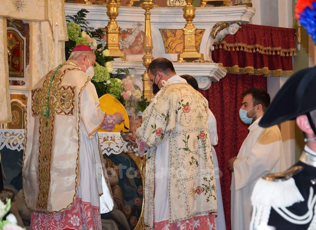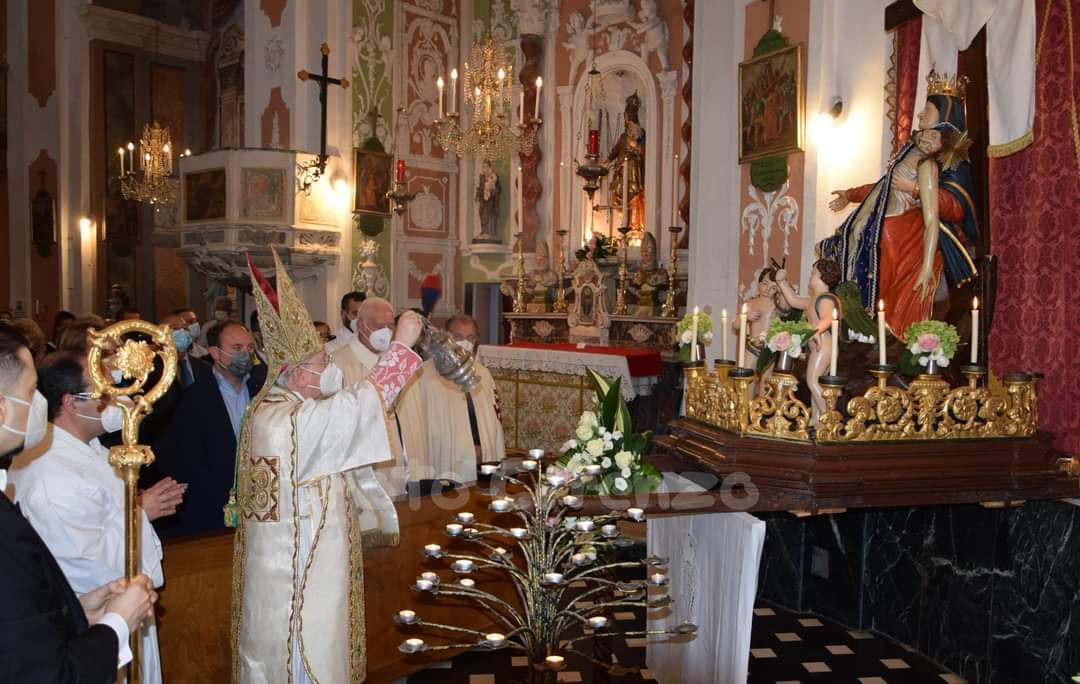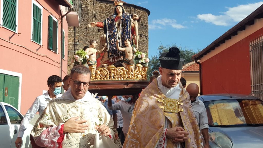 Domenica 19 Settembre ad Aurigo è stata celebrata la festa in onore della Madonna Addolorata. Al mattino la SS. Messa Pontificale presieduta dal Vescovo emerito della Diocesi di Albenga-Imperia Mons. Mario Oliveri con la Benedizione della statua della Vergine Maria restaurata dopo dieci mesi di lavoro, da parte del laboratorio di restauro “Gavaldo”di Alassio.