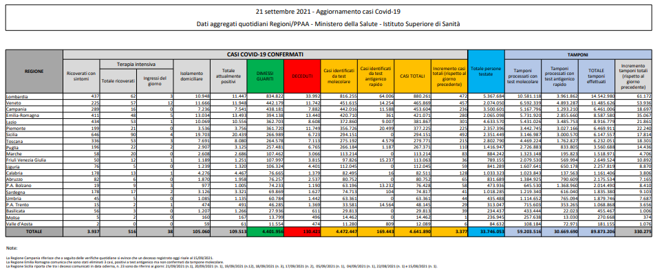 330.275 i tamponi effettuati, con un tasso di positività al 1% (ieri 2%). Nelle ultime 24 ore, si sono registrati 67 morti (ieri erano 44)