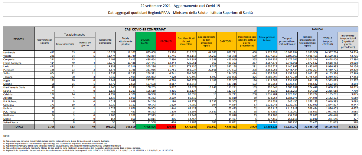 Covid, Italia: il bollettino di mercoledì 22 settembre