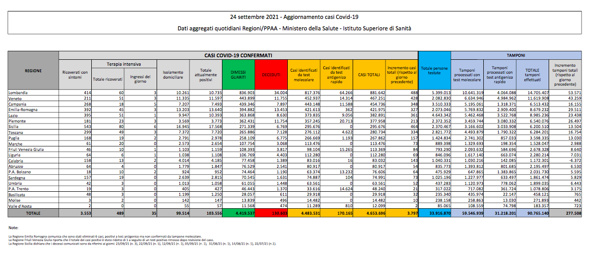 Covid, Italia: il bollettino di venerdì 24 settembre