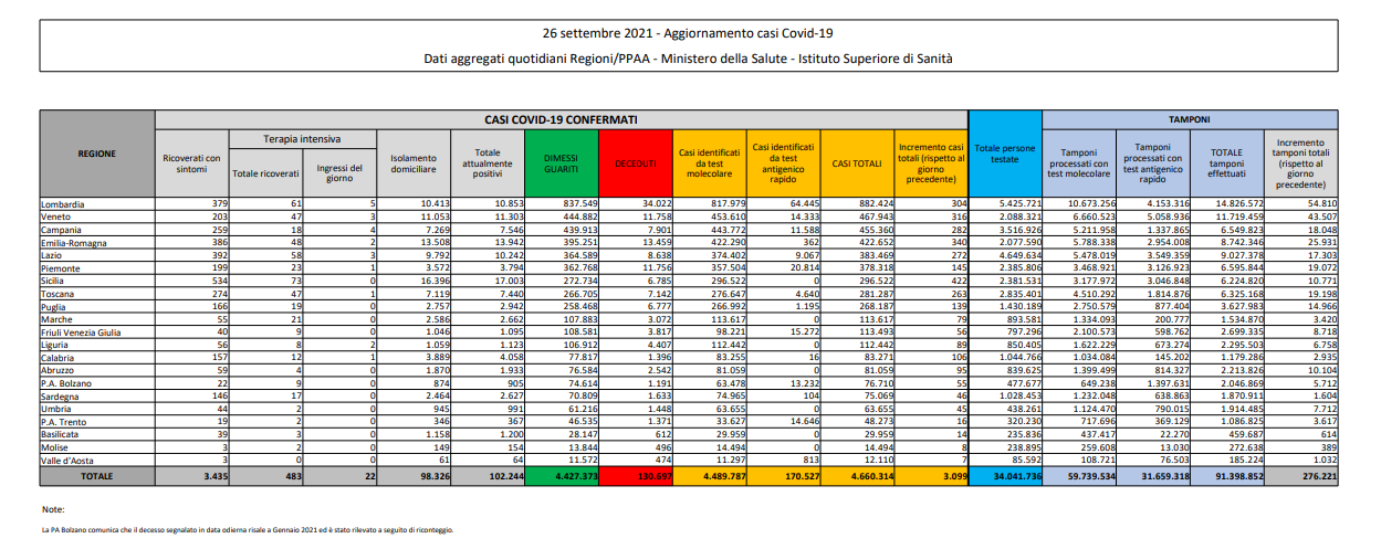276.221 (ieri 357.491 ) i tamponi effettuati, con un tasso di positività all’1,1% (ieri 1%). Nelle ultime 24 ore, si sono registrati 44 morti (ieri erano 50).