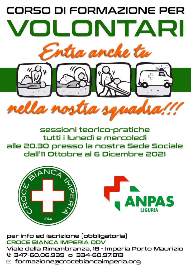 L’11 ottobre 2021 inizierà il nuovo corso di formazione per diventare volontari della Croce Bianca Imperia. L’appuntamento per compiere il primo passo per entrare nel mondo dell’assistenza e del soccorso sanitario è alle ore 20.30 presso la sede sociale di Viale della Rimembranza 18.