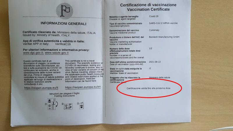 Andando per ordine – racconta Vaccaro – io ho fatto la prima dose di vaccino anti Covid lo scorso 13 settembre, sapendo che avrei dovuto attendere circa un paio di settimane per avere il green pass. Domenica 26 settembre (quindi a distanza di 13 giorni) ho chiamato una farmacia per chiedere informazioni su quando sarebbe stato possibile avere il green pass e non mi sono state fornite risposte certe. In ogni caso, sono poi riuscito a farmelo stampare presso una farmacia e, come riportato nella fotografia, il documento recita: ‘Certificazione valida fino alla prossima dose’.