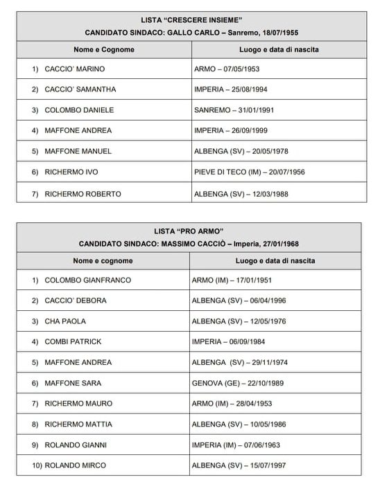 Armo è l’unico comune di questo territorio in cui in questa tornata elettorale compaiono due liste, che però, in realtà, non sono affatto contrapposte. Una è quella del sindaco uscente Massimo Cacciò e l’altra è guidata da Carlo Gallo, che sosteneva e ancora sosterrà Cacciò. La presenza di due liste, fra l’altro, evita la necessità del quorum minimo di votanti.