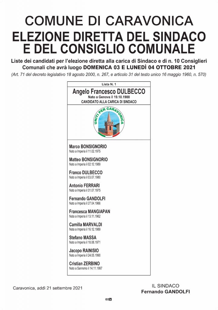 Unico candidato sindaco a Caravonica è Angelo Dulbecco, che dice: “Il senso di appartenenza e di comunità è quello che ci anima. Ho sempre avuto passione per la politica, ma soprattutto per il mio territorio, così come le persone che sono in lista con me, per potare avanti un programma di cose concrete a favore della comunità. Abbiamo visto un progressivo scollamento della gente dalla politica, ma noi nel nostro piccolo siamo in controtendenza con diverse persone della passata amministrazione pronte ad andare avanti e anche volti nuovi e giovani. Io ho fatto parte della precedente amministrazione e ora ho accettato di ricoprire questo ruolo perché mi fa piacere mettermi a disposizione del mio paese, per continuare il lavoro fatto fino ad adesso e cercare di portare a casa qualche risultato in più. Abbiamo bisogno di stare con i piedi per terra e ottenere risultati semplici, ma importanti, come, per esempio, nuovi parcheggi nel capoluogo e nelle frazioni, per aumentare la sicurezza, poi la pulizia e il decoro, che restano il punto fondamentale del programma. Vorremmo migliorare alcuni carruggi e prestare attenzione agli acquedotti; procedere alla sistemazione definitiva della toponomastica e dell’illuminazione pubblica, con la speranza anche di rivitalizzare il nostro paese e farlo conoscere meglio, visto che abbiamo anche delle chicche storiche. Abbiamo la volontà di far conoscere il nostro paese, dandogli anche un po’ di spirito turistico in più“.