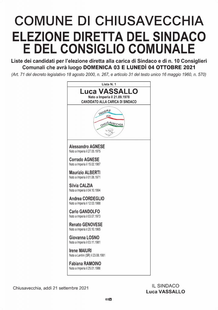 A Chiusavecchia ricandidatura per il sindaco uscente Luca Vassallo. Dice Vassallo: “Abbiamo deciso di ricandidarci e ripresentare la squadra al completo, con un salo cambio di consigliere nelle frazioni di Sarola e Olivastri. In questi cinque anni abbiamo fatto un grande lavoro e numerosi progetti e alcuni sono ancora in fase di cantierizzazione e per i prossimi cinque anni dobbiamo ultimare quello che abbiamo iniziato e abbiamo alcuni sogni nel cassetto per migliorare ancora il nostro paese e il nostro territorio”.