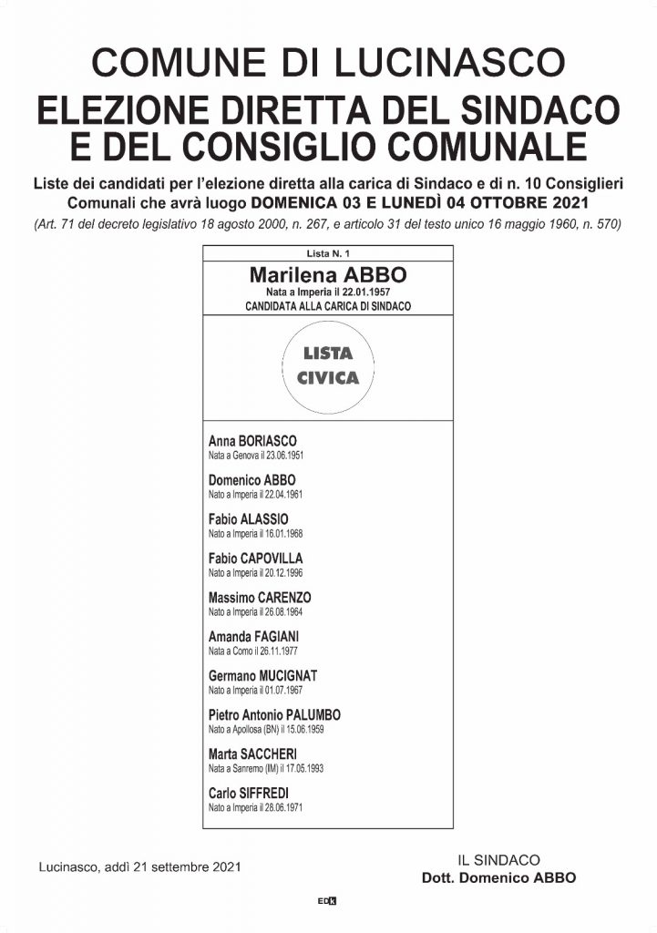 Lucinasco avrà una donna sindaco. E’ Marilena Abbo, unica candidata, che, come i suoi colleghi, dovrà soltanto superare il quorum quest’anno ridotto al 40%.