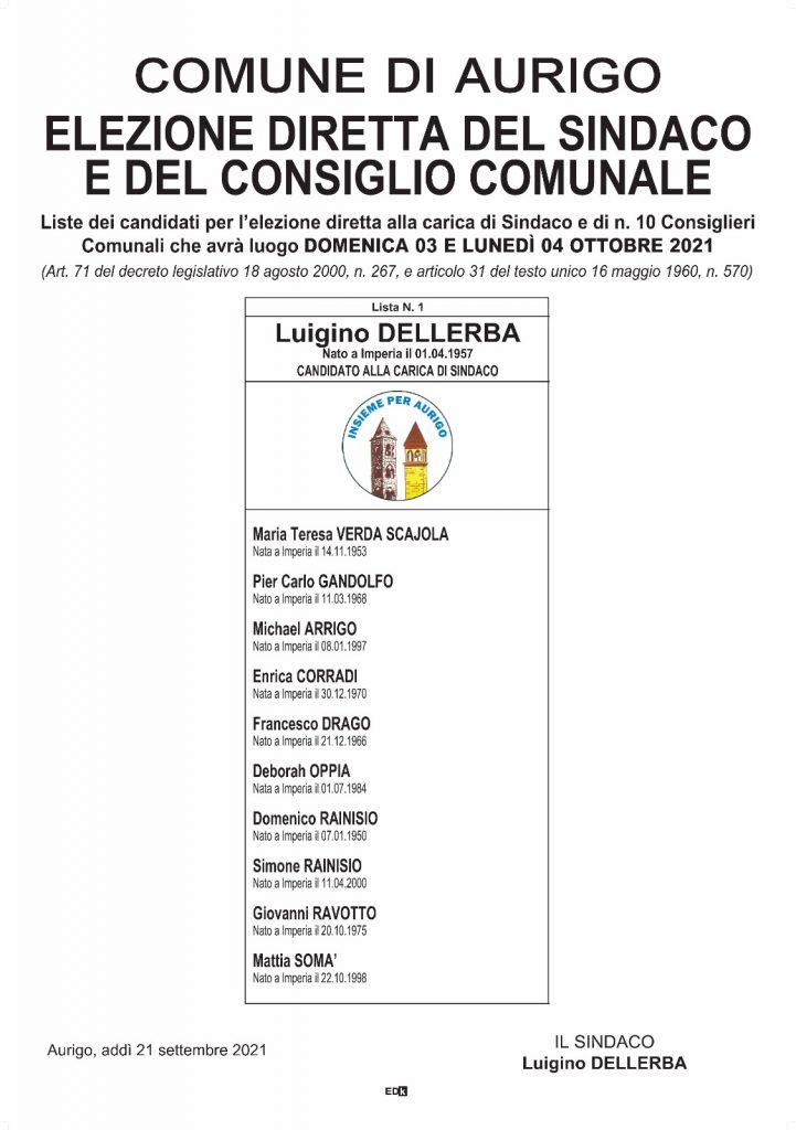Ad Aurigo ricandidatura per il sindaco uscente Luigino Dellerba. Che spiega: “Mi ricandido per il settimo mandato nel rispetto della legge. Ho fatto i primi quattro poi le soste con due colleghi sindaci e mi sono ricandidato nel 2011. Quindi ora mi sono ricandidato per il terzo mandato consecutivo, come prevede la legge. Lavori ne abbiamo fatto tantissimi in quiesti anni e in questo momento stiamo completando quelli del Palazzo comunale con un impianto fotovoltaico, un ascensore, lo spostamento degli uffici dal piano terra al primo piano e abbiamo in mente di fare un qualcosa di importante anche al secondo piano. Ho sempre fatto il tutto con il massimo dell’impegno e ancora adesso, dopo tanti anni (sono entrato in comune a 21 ani nel 1978), ho sempre lo stesso entusiasmo, anche perché ho sempre potuto avere tanti ragazzi nella mia lista e ragazze che portano l’età media dei candidati a 41 anni e credo che per un comune piccolo sia un aspetto positivo”.