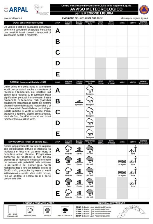 Lunedì deciso peggioramento su tutta la regione con precipitazioni diffuse di intensità fra moderata e forte che daranno luogo a cumulate areali elevate. Progressivo aumento dell’instabilità con bassa probabilità di rovesci o temporali forti nelle ore notturne, alta probabilità dalla mattina e in particolare nel pomeriggio. Venti meridionali fino a forti con raffiche intorno ai 60-80 km/h; probabile ingresso di venti settentrionali in serata. Mare molto mosso, fino ad agitato in serata su Levante e parte occidentale del centro regione.