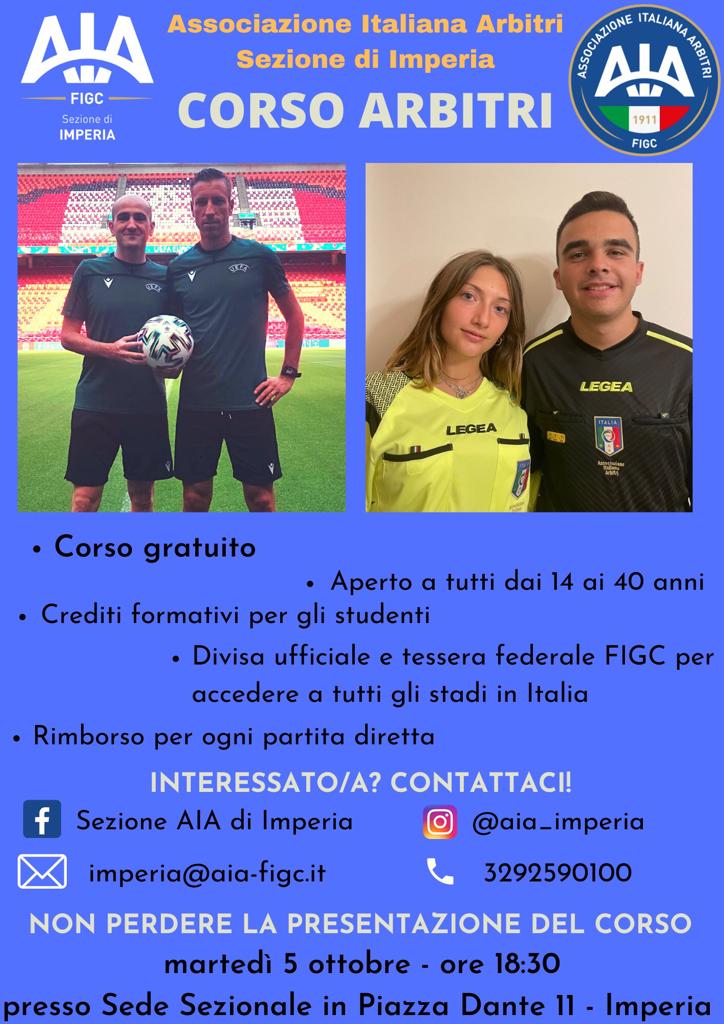 La sezione di Imperia organizza un nuovo corso gratuito per arbitri dedicato a ragazzi/e dai 14 ai 40 anni di età. La presentazione del corso è in programma martedì 5 ottobre alle 18.30 nei locali sezionali di Piazza Dante 11 a Imperia. Per informazioni telefonare al numero 329 2590100 oppure scrivere a imperia@aia-figc.it.