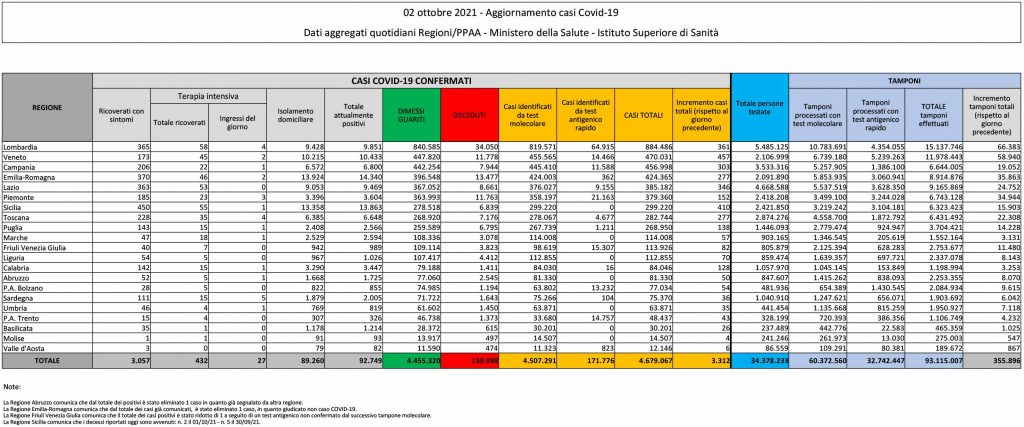 Sono 3.312 i nuovi casi di coronavirus in Italia (ieri sono stati 3.405). I decessi odierni sono 25 (ieri sono stati 52), per un totale di 130.998 vittime da febbraio 2020. I casi totali dall’inizio dell’epidemia sono 4.679.067. I guariti sono 4.187 (ieri 4.007), per un totale di 4.455.320. Ancora in calo il numero degli attualmente positivi, 903 in meno (ieri -656) e sono 92.749.