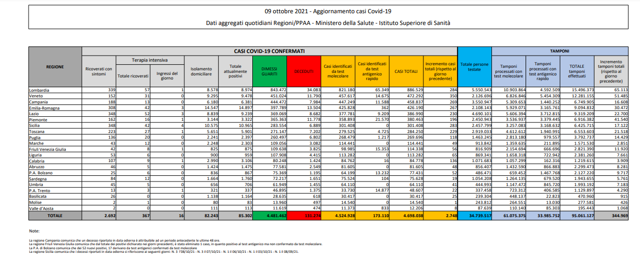 Covid, Italia: il bollettino di sabato 9 ottobre
