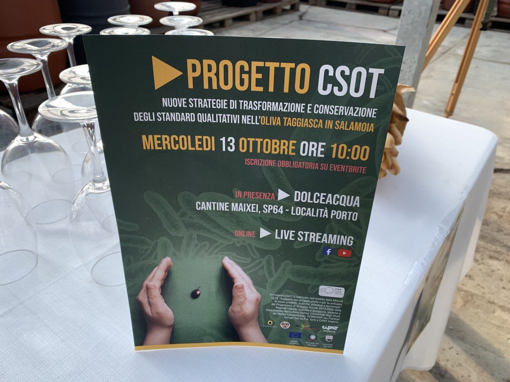 Il Progetto CSOT è realizzato nell’ambito della Misura 16.02 “Supporto per progetti pilota e per lo sviluppo di nuovi prodotti, pratiche, processi e tecnologie” del Programma di Sviluppo Rurale 2014-2020 della Regione Liguria. Capofila è Oroliguria, insieme a Dipartimento Agricoltura Unimol (Università degli Studi del Molise-Campobasso), FLORCOOP (ex Frantoio sociale Dol.Va.Pre. scrl) e CIPAT Imperia.