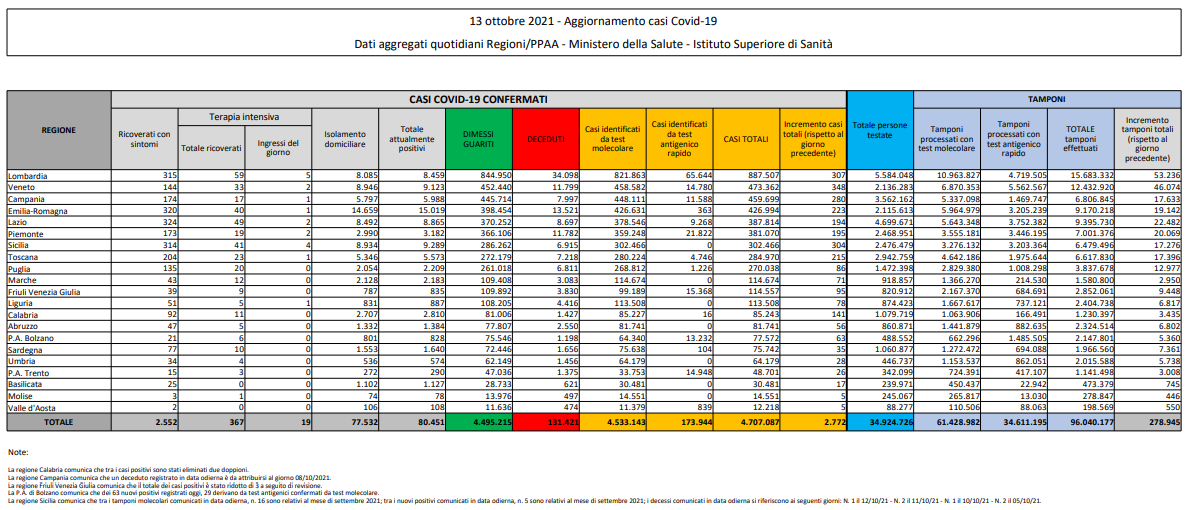 Covid, Italia: il bollettino di mercoledì 13 ottobre