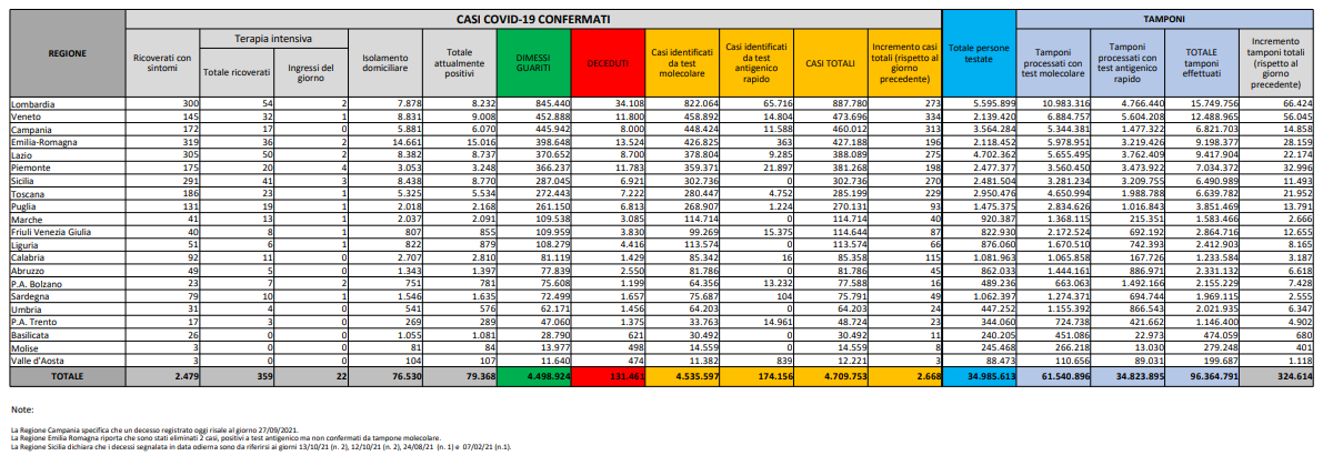 324.614 i tamponi effettuati (ieri 278.945), con un tasso di positività allo 0,8% (ieri 1%). Nelle ultime 24 ore, si sono registrati 40 morti (ieri 37).