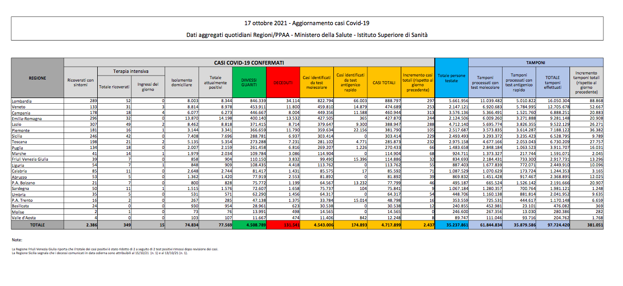 Covid, Italia: il bollettino di domenica 17 ottobre