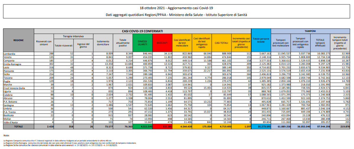 219.878 i tamponi effettuati, con un tasso di positività allo 0,7% (ieri 0,6%). Nelle ultime 24 ore, si sono registrati 44 morti (ieri 24).