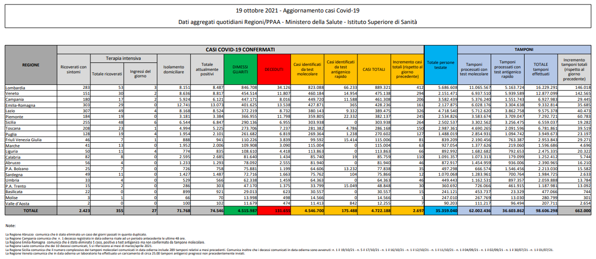 Covid, Italia: il bollettino di martedì 19 ottobre