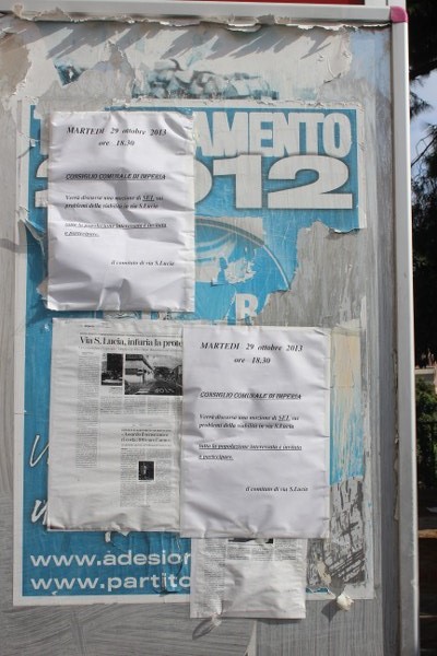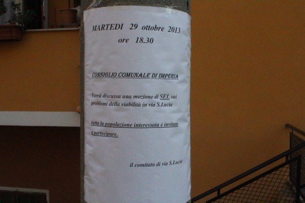Il Comitato di via Santa Lucia al consiglio comunale di martedì prossimo. Non si ferma la protesta e la mobilitazione del comitato di via Santa Lucia che in questi giorni ha tappezzato la via di manifesti per informare i residenti della discussione in consiglio comunale di una mozione (clicca QUI) presentata dal consigliere di “Imperia Bene Comune” Mauro Servalli sul ripristino del doppio senso di marcia. Parteciperanno, dunque, numerosi e porteranno con loro, oltre alle proposte, anche le moltissime firme raccolte contro la decisione del sindaco Carlo Capacci di istituire il senso unico anche nei primi 150 metri della via.