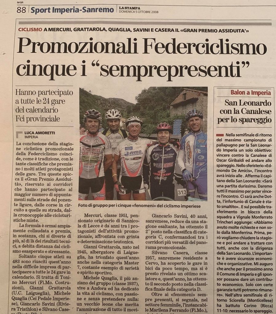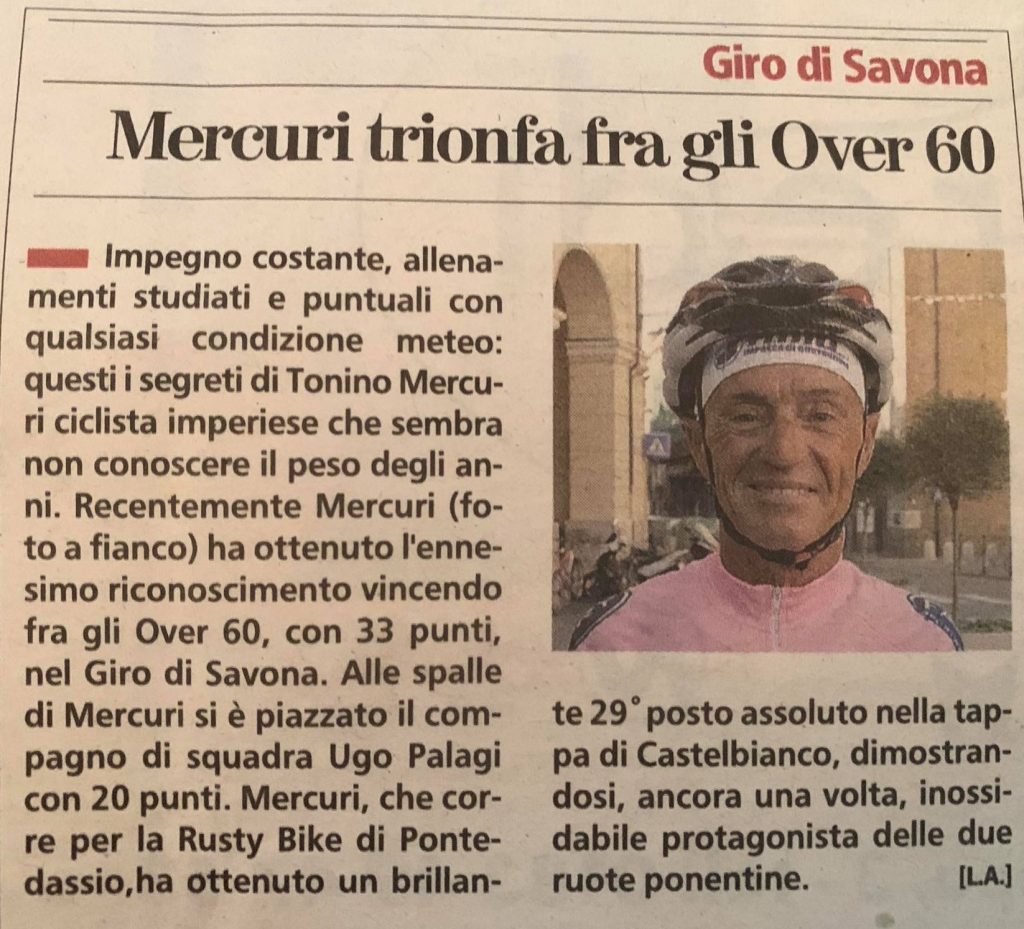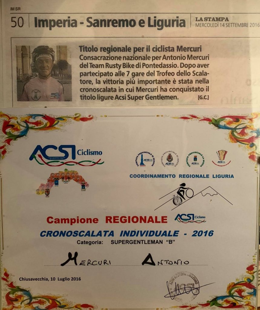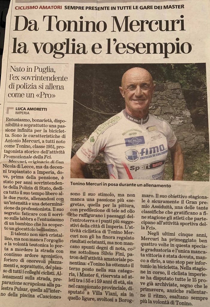 Antonio Mercuri, “Tonino” per gli amici, 70 anni e non sentirli. Un passato da poliziotto, in servizio nella questura di Imperia e una grande passione per il ciclismo. Dopo aver collezionato diversi successi, la scelta di ritirarsi dall’agonismo.