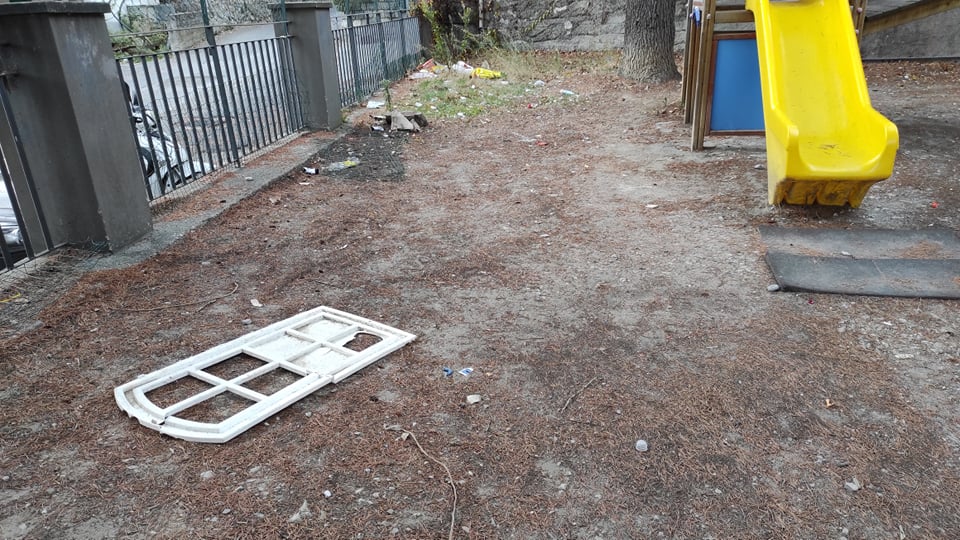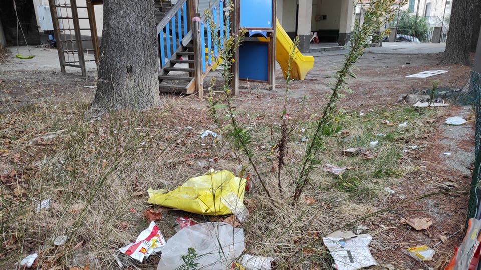 A distanza di cinque mesi, la situazione appare invariata, anzi, peggiorata, vista la massiccia presenza di rifiuti ed erbacce, alcune finestre rotte, giochi danneggiati e diversi altri danni.