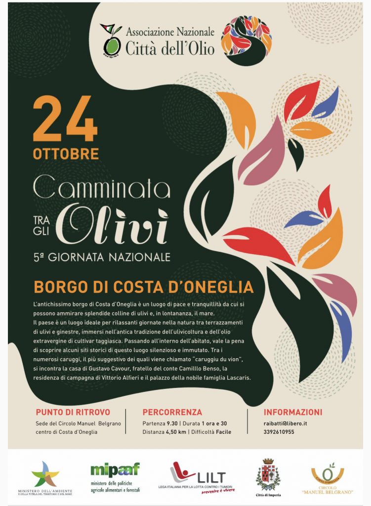 Domenica 24 ottobre torna la camminata tra gli ulivi a Costa d’Oneglia, 5^ giornata nazionale dell’Associazione Nazionale Città dell’Olio.