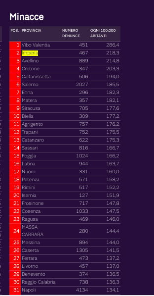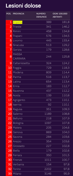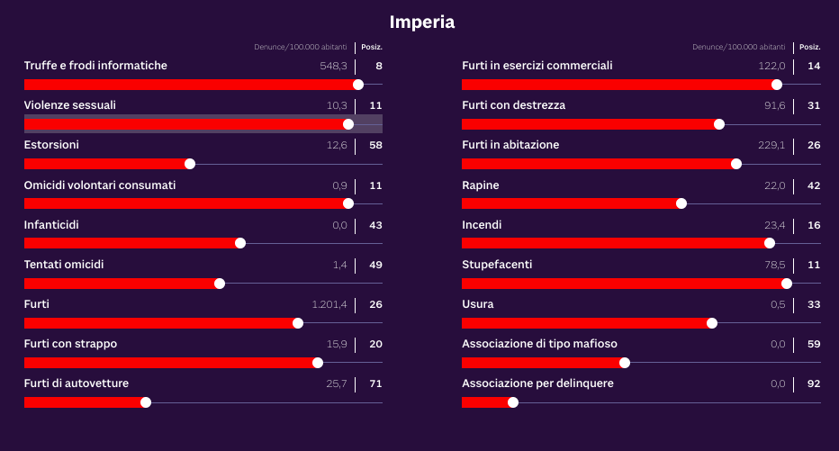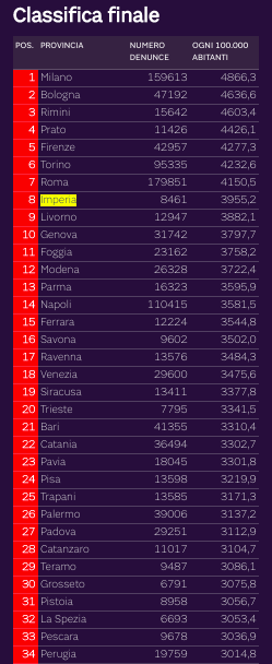 Ecco le posizioni della provincia di Imperia per gli altri reati: