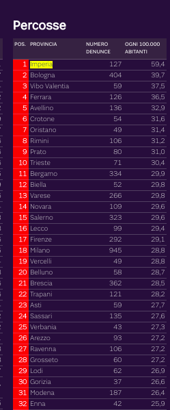 Per quanto riguarda le singole tipologie di reato, sono 37 quelle analizzate dal report, Imperia veste la “maglia nera” per percosse (127 denunce, 59.4 su 100mila abitanti) e lesioni dolose (389 denunce, 181.8 su 100mila abitanti), classificandosi al primo posto in tutta Italia. Secondo posto, dopo Vibo Valentia, per minacce (467 denunce, 218.3 su 100mila abitanti).