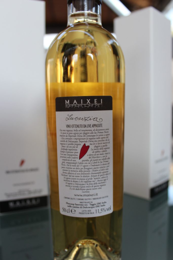 L’enologo Fabio Corradi sottolinea: “Lucrezia è un vino ottenuto da uve passite e non ha una denominazione. Le uve sono Vermentino, Pigato e un goccio di Moscatello di Taggia. Volevamo fare un vino molto bevibile, da abbinare con la michetta di Dolcecaqua, con i formaggi e con il foi gras, che fosse appunto fresco e bevibile. Abbiamo cercato questa soluzione e speriamo di averla trovata. Lucrezia nasce dalla volontà di legarci ancora di più a Dolceacqua, con la leggenda di questa ragazza che non volle cedere alla regola dello jus primae noctis e per questo si lasciò morire. L’etichetta è di Francesco Musante, che è un pittore genovese importante“.