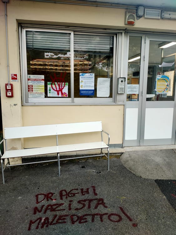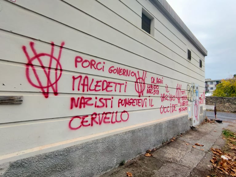 “Maledetti nazisti pungetevi il cervello“, “Draghi lurido nazista“, “Il Vaccino uccide“, “Toti merda vivente fai schifo“, “Draghi nazista maledetto“ alcune delle scritte comparse.