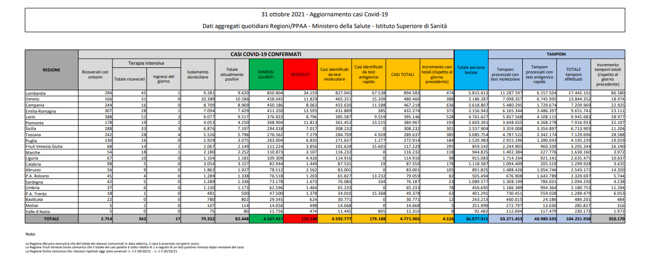 350.170 i tamponi effettuati (ieri 477.352 ), con un tasso di positività all’1.3% (ieri era all’1%). Nelle ultime 24 ore, si sono registrati 26 morti (ieri 37).