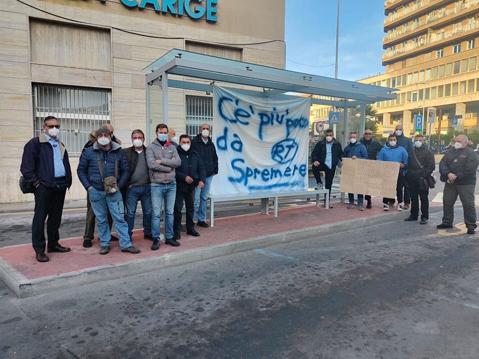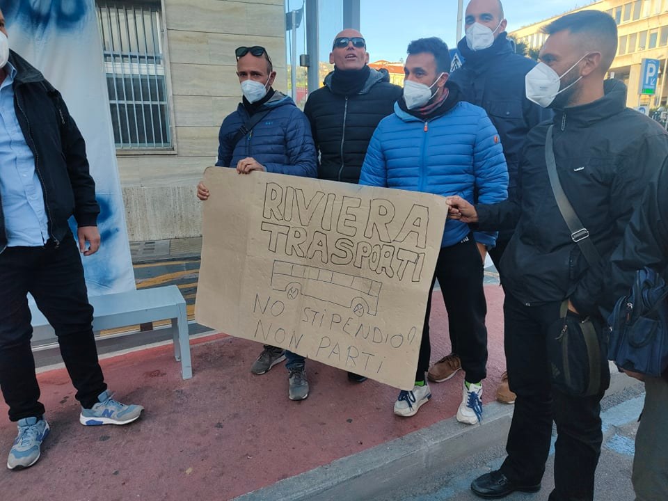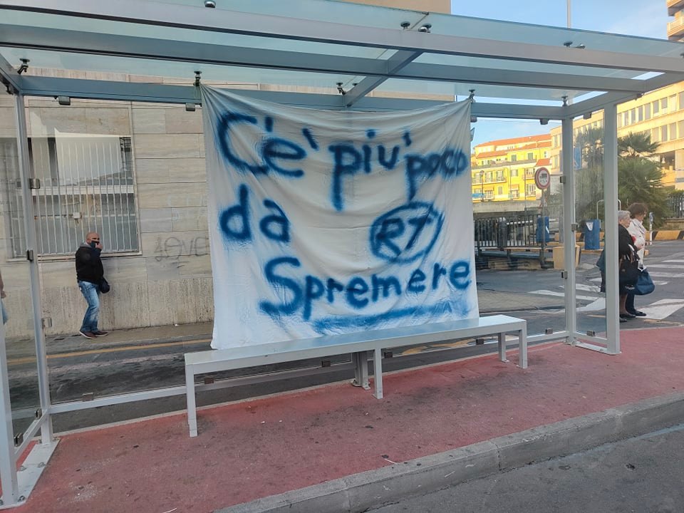 I lavoratori, dopo essersi letteralmente messi in mutande (“è così che ci ha lasciato l’azienda”) hanno esposto uno striscione e un cartello per proseguire la protesta, proprio nei giorni di OliOliva, la manifestazione enogastronomica per eccellenza del capoluogo ligure. “Riviera Trasporti. No stipendio? Non parti” e “Rt, C’è più poco da spremere“.