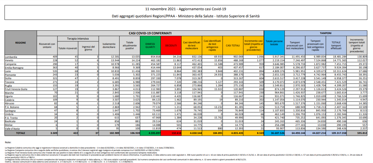 Covid, Italia: il bollettino di giovedì 11 novembre