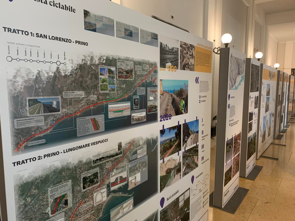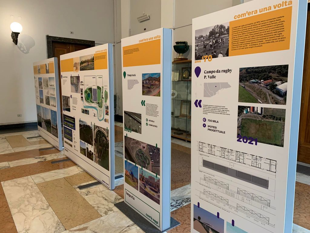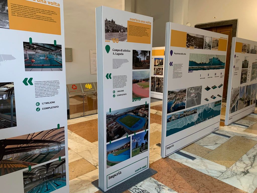 I pannelli espositivi mostrano alcune immagini dell’Imperia prima del Decreto di unione del 1923, dell’Imperia che è oggi e di quella che sarà o che potrebbe essere. La prima parte della mostra è dedicata alla Viabilità, a partire dalla Pista ciclabile e dall’Aurelia Bis, cui si affiancano l’allargamento di via Agnesi, il rifacimento di via Ballestra a Piani, il completamento della bretella stradale di Caramagna e molte altre opere che interesseranno tutto il capoluogo. Un occhio di riguardo viene riservato allo sviluppo del verde urbano, con la riqualificazione dei Giardini Toscanini, di piazza Roma e dell’intero parco di Villa Grock.
