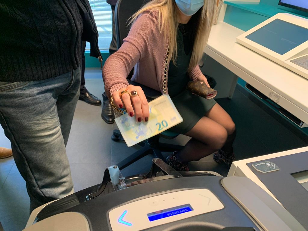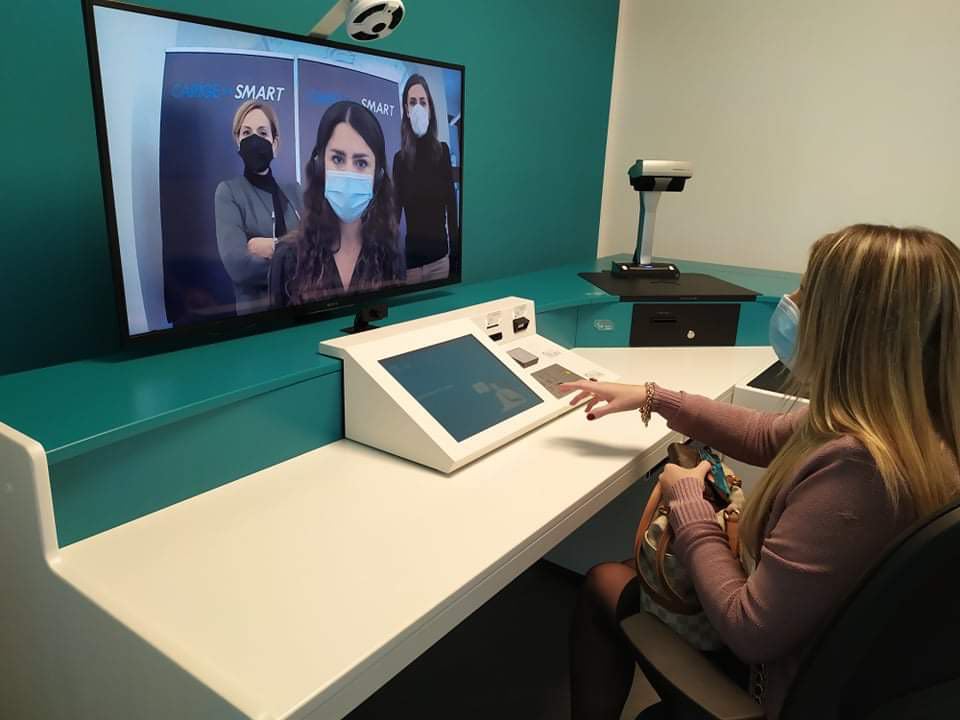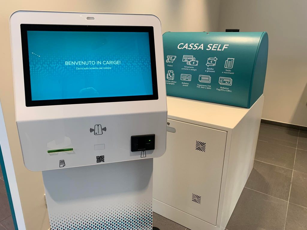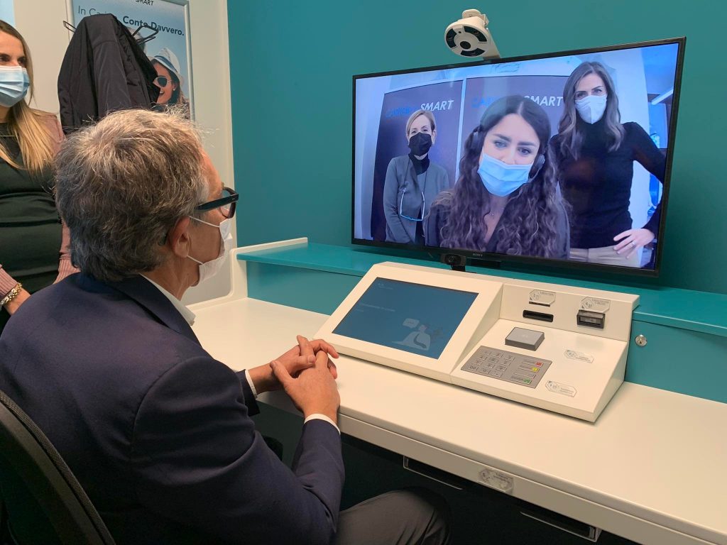 “Qui abbiamo i nostri gestori che da remoto si collegano. Sostanzialmente controllano tutta l’apparecchiatura. Così come il collega in una filiale tradizionale mette a disposizione banconote, monete, acquisisce e fornisce documentazione, alla stessa maniera lo possono fare i nostri colleghi da remoto. Uno spazio riservato, nel quale il cliente può rapportarsi con i nostri gestori e fare le operazioni di necessità. Versamenti, prelievi, pagamento F24, bollette e così via, gestione di finanziamenti e investimenti. Questo cercando di mettere a disposizione le nostre migliori competenze, con un supporto da remoto che svincola dalla fisicità che talvolta limita questo tipo di disponibilità”.