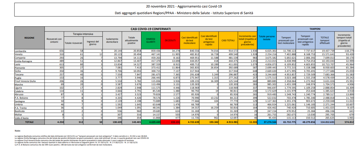 Covid, Italia: il bollettino di sabato 20 novembre