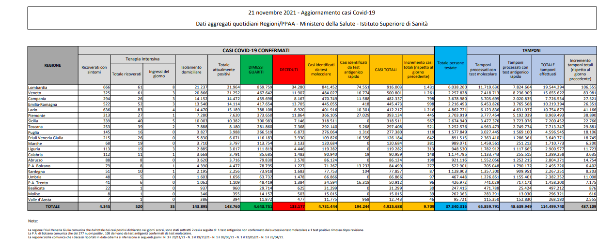 487.109 i tamponi effettuati (ieri erano 574.812), con un tasso di positività al 2% (anche ieri 2%). Nelle ultime 24 ore, si sono registrati 46 morti (ieri erano 49).